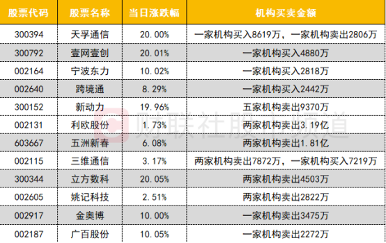 卖出方面,抖音概念股利欧股份遭机构卖出3.19亿;机器人概念股五洲新春遭机构卖出1.81亿。