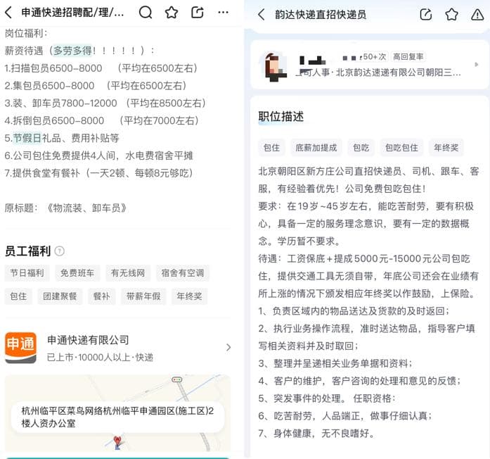 而BOSS、智联等招聘平台上,申通快递员的招聘信息和商家对五险一金的缴纳也不统一。比如BOSS招聘平台上,“申通快递有限公司”只强调了薪资待遇多劳多得,有节假日补贴,但未明确社保缴纳情况,北京鹏起申通货运代理有限公司则明确提供完善的社保;智联招聘上,韵达、顺丰等招聘信息则明确表示缴纳社保。
