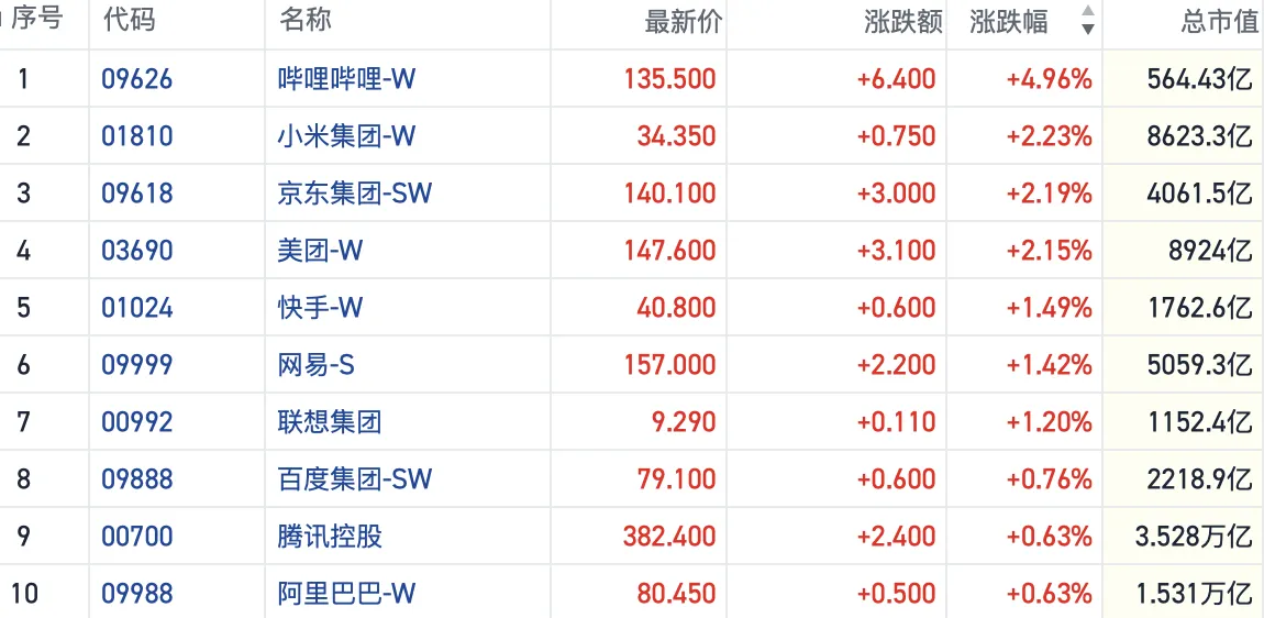 今日盘面上,大型科技股集体上涨,小米、京东、美团涨超2%,快手、网易涨1.4%,百度、腾讯、阿里巴巴飘红。