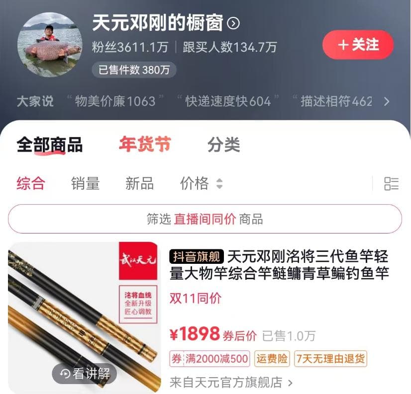 邓刚抖音商品橱窗页显示,其自营品牌商品已售380万件,跟买人数高达134.7万。1898元一根的鱼竿都卖出去一万件了。