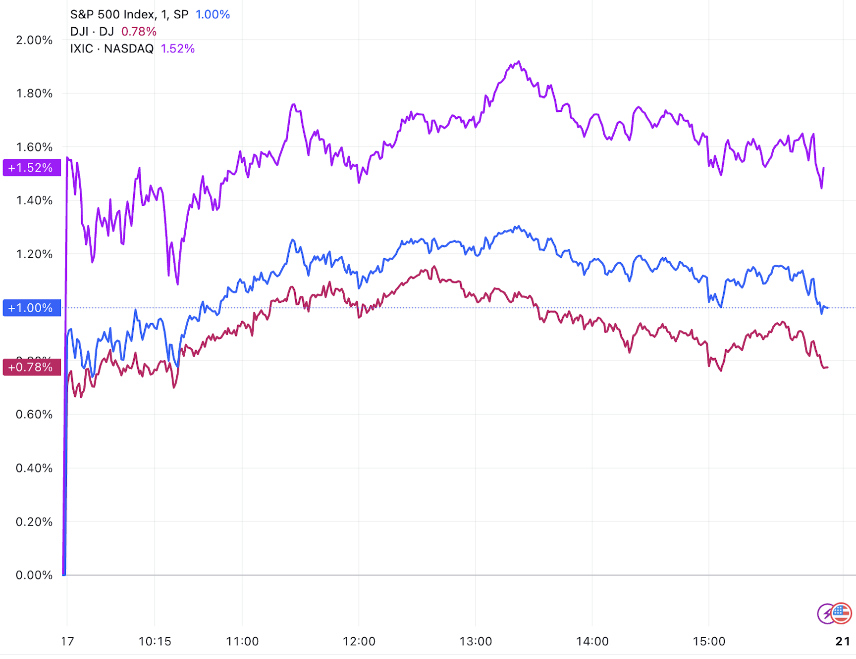 截至收盘,道琼斯指数涨0.78%,报43,487.83点;标普500指数涨1.00%,报5,996.66点;纳斯达克指数涨1.51%,报19,630.20点。