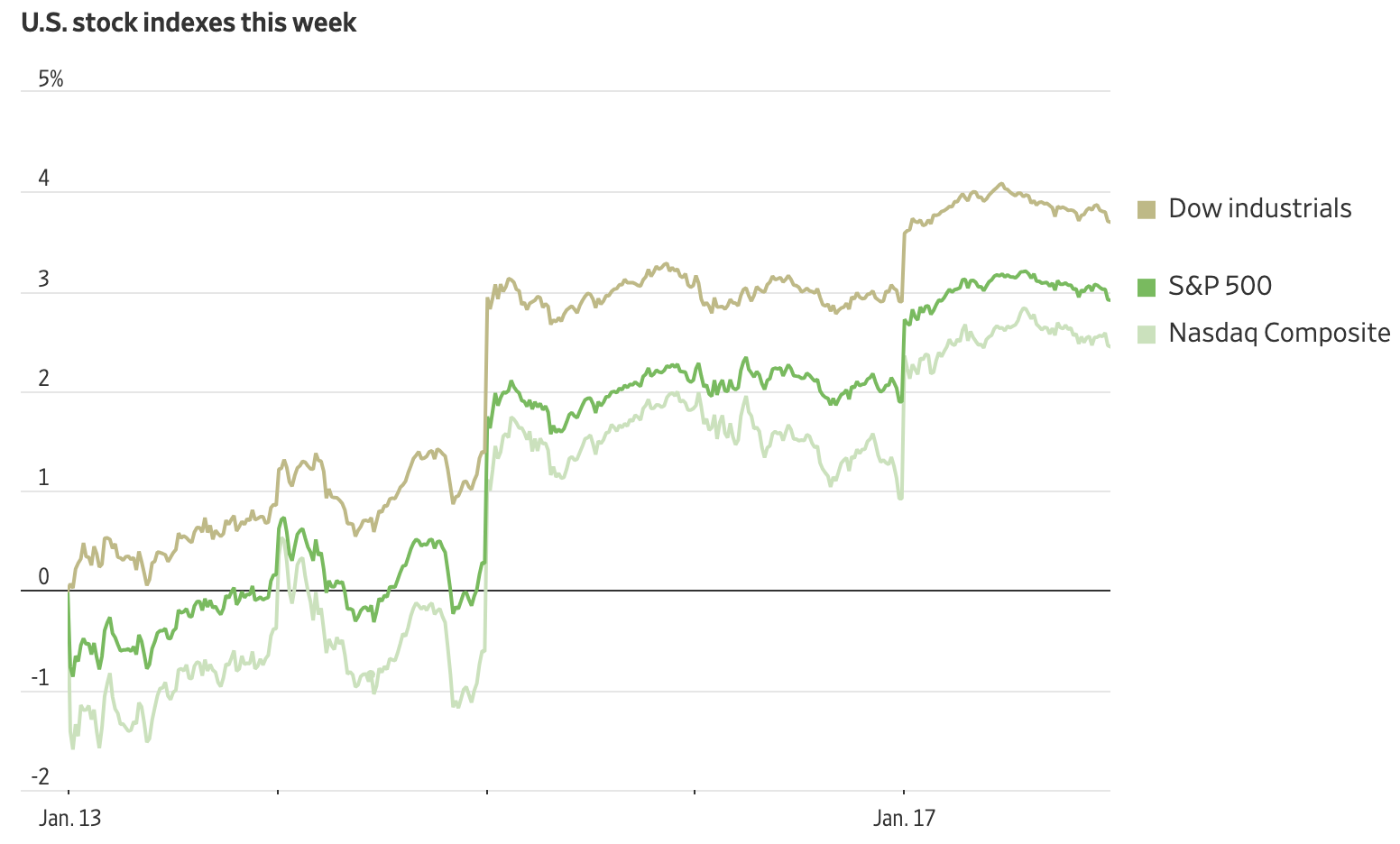 道指和标普500指数本周分别上涨了3.69%和2.91%,创下自去年11月美国总统选举周以来的最大单周涨幅。纳指本周上涨了2.45%,创下自12月初以来的最佳单周表现。