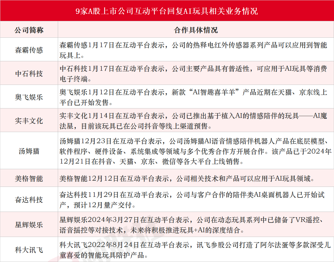 据财联社不完全统计,截至发稿,包括森霸传感、中石科技、奥飞娱乐、实丰文化、汤姆猫、美格智能、奋达科技、星辉娱乐和科大讯飞在内的9家A股上市公司在互动平台回复AI玩具相关业务情况,详细情况如下图: