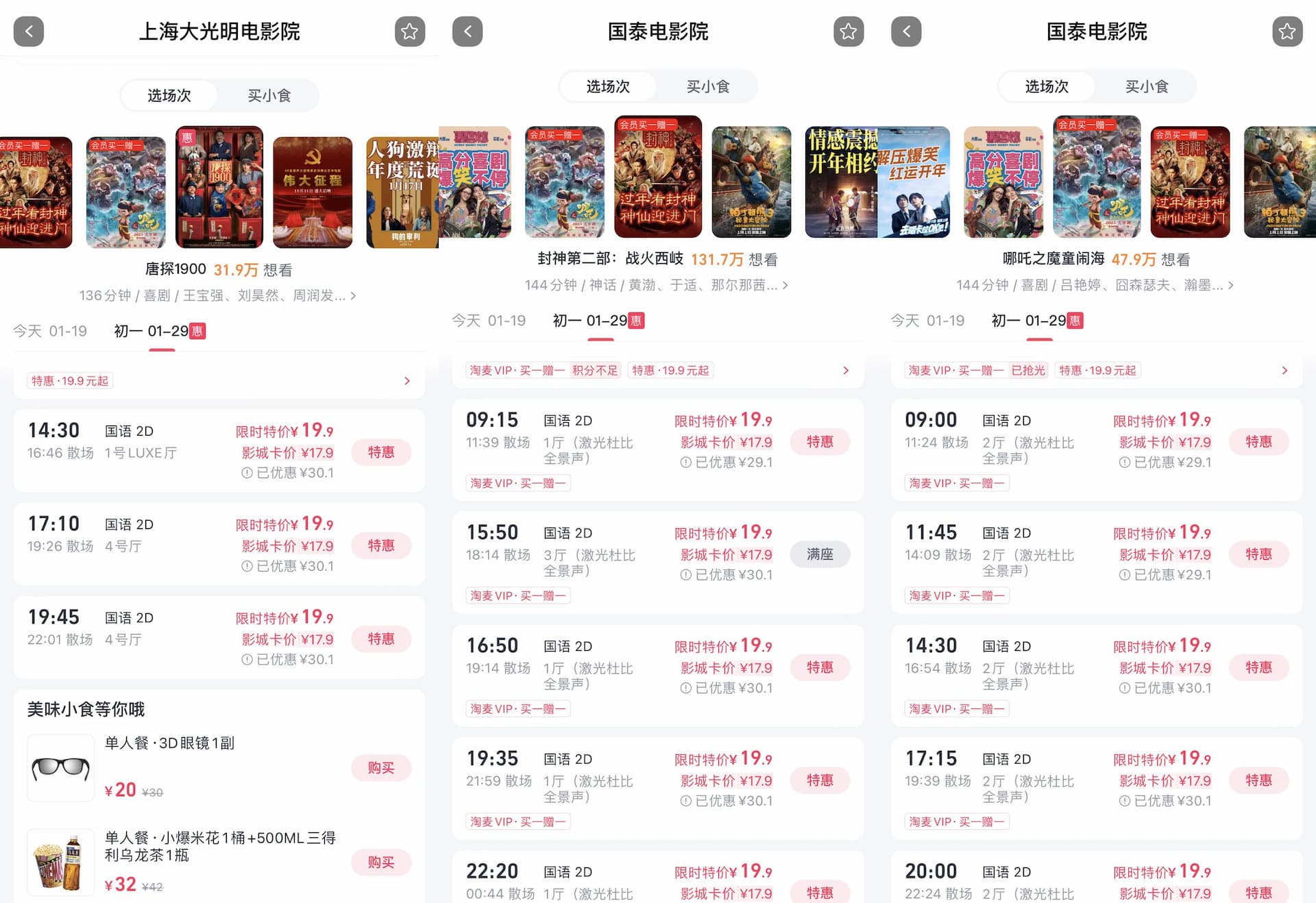 财联社记者在淘票票、猫眼等购票平台上发现,不少新片在初一(1月29日)场次出现了19.9元的特价票。据了解,这些优惠通常是片方拿出发行预算做促销活动,旨在带动观影人数的增长。