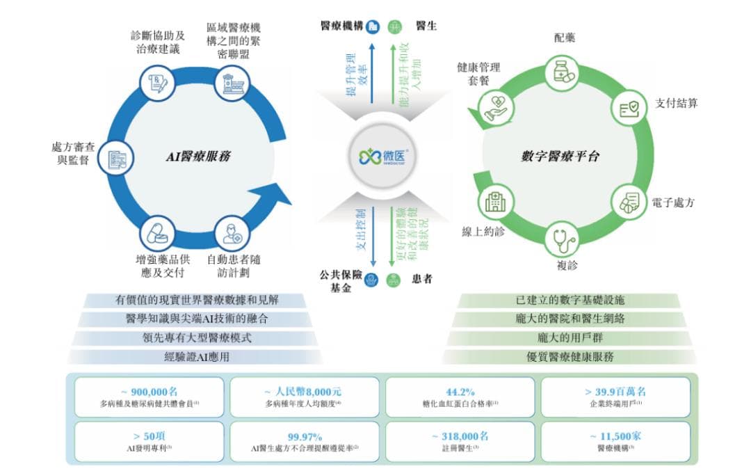根据弗若斯特沙利文资料,2023年按收入划分,微医已是中国AI医疗健康解决方案的最大提供商,市场份额达到10.6%,为第二名的两倍;亦是中国唯一一家透过按人头及按价值付费的模式提供健康管理会员服务的AI医疗健康解决方案提供商。