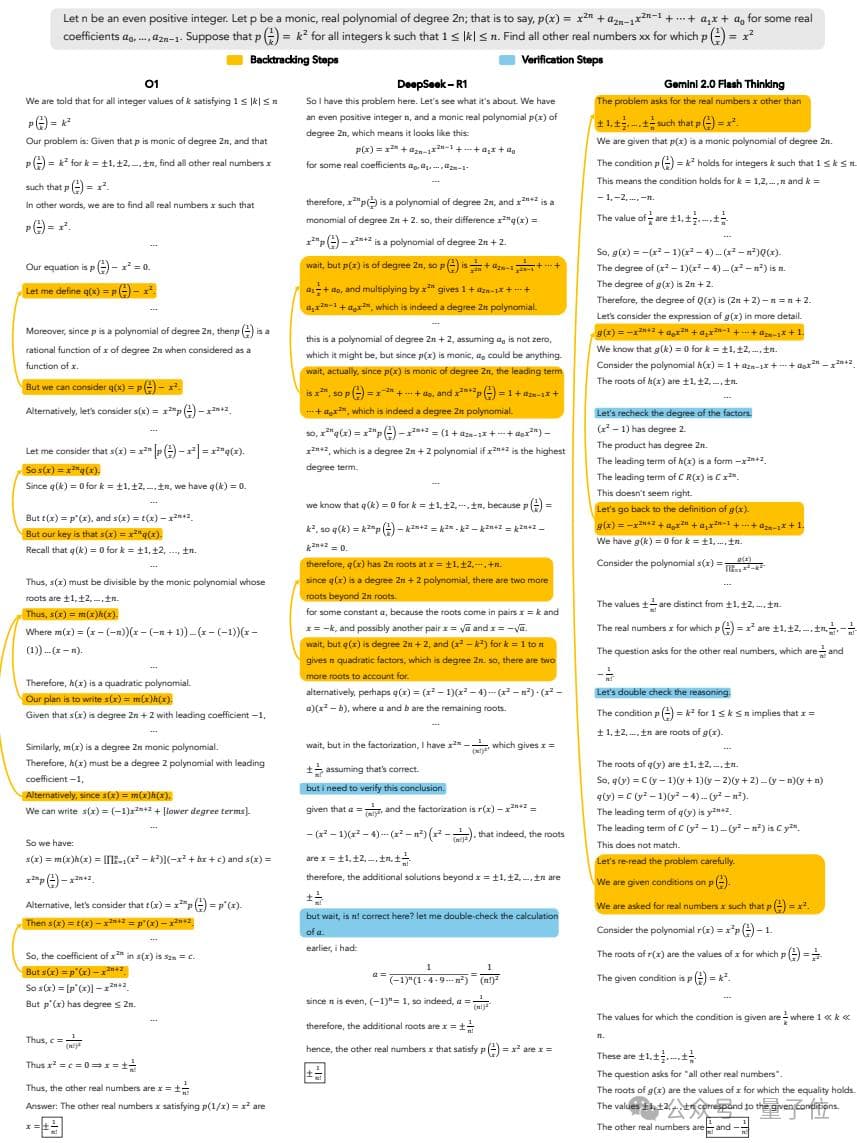 回溯实验结果:在回溯实验中,o1、DeepSeek-R1、Gemini 2.0 Flash Thinking等模型在解答数学题的过程中,在复杂数学问题上的表现都随着回溯次数的增加而提高。这表明回溯是一种有效的错误纠正机制。