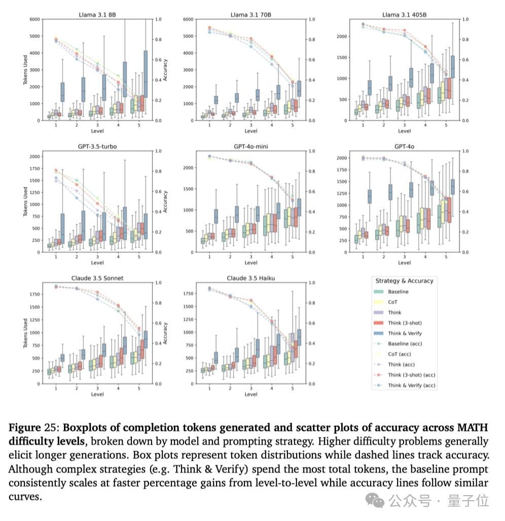 而o1模型在简单问题上生成的tokens数与人类相当,在高难度问题上,生成tokens数则大幅增加,与传统模型拉开差距。