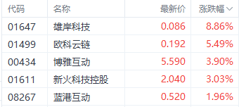 紧随其后的是加密货币概念股。截至收盘,博雅互动(01647.HK)、雄岸科技(01647.HK)、蓝港互动(08267.HK)分别上涨8.86%、5.49%、31.96%。