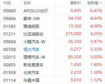 再者是汽车股。截至收盘,蔚来-SW(09866.HK)、小鹏汽车-W(09868.HK)、理想汽车-W(02015.HK)分别上涨4.44%、4.25%、3%。
