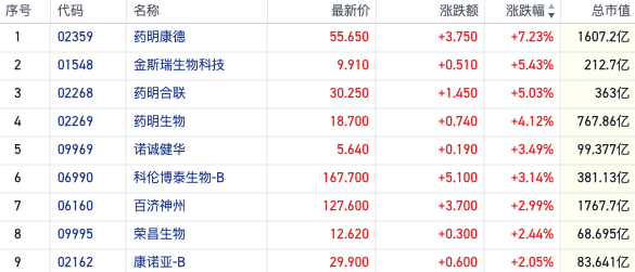 截至收盘,药明康德(02359.HK)涨超7%,金斯瑞生物科技(01548.HK)、药明合联(02268.HK)均涨超5%,药明生物(02269.HK)涨逾4%。