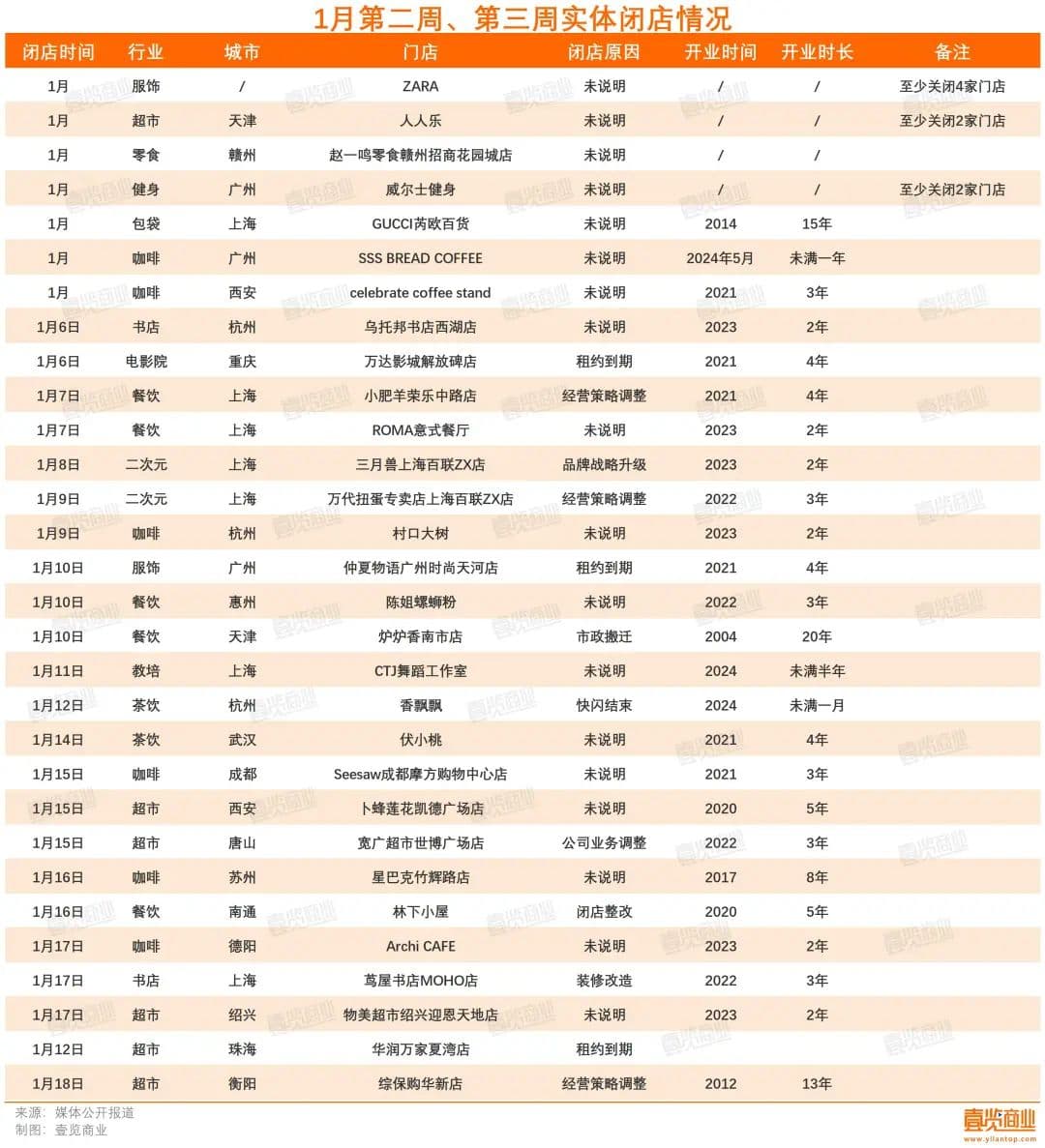 据壹览商业不完全统计,1月第二周和第三周,共有30个品牌关闭了至少35家门店。