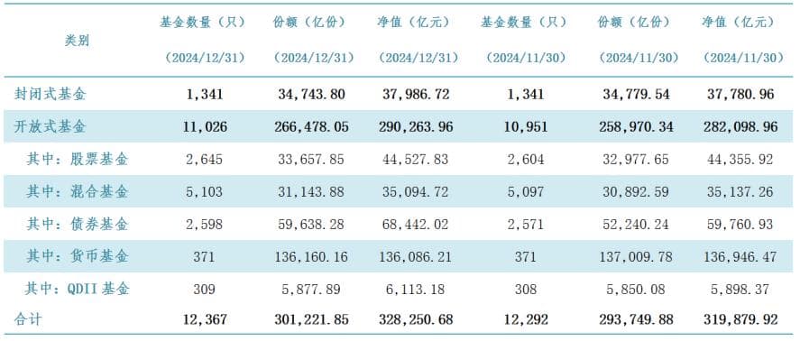 与此同时,截至2024年12月底,公募基金的总份额达到30.12万亿份,较11月底的29.37万亿份增加了7471.97亿份。