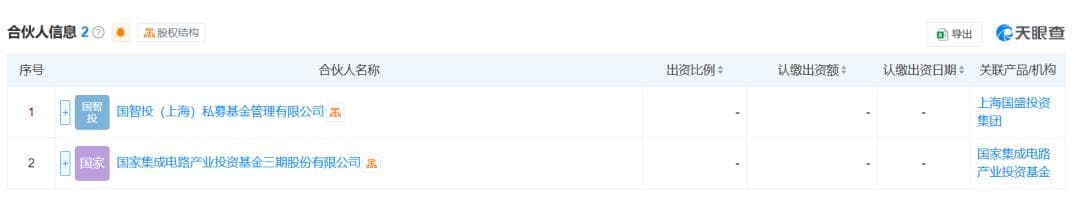 天眼查显示,该人工智能产业投资基金有着两位重磅出资方:国家集成电路产业投资基金三期股份有限公司(简称“国家大基金三期”),以及国智投(上海)私募基金管理有限公司(简称“国智投私募”)。