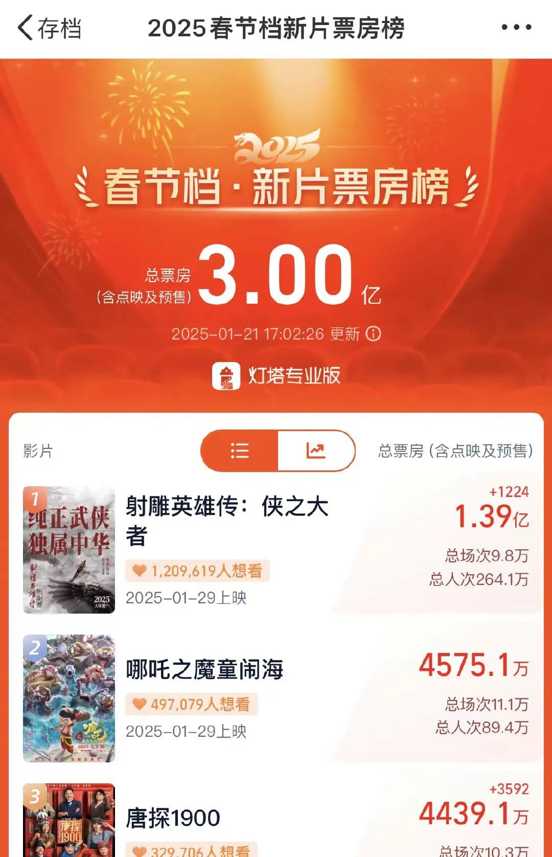 据灯塔专业版,截至1月21日16时50分,2025年春节档上映新片预售总票房突破3亿元。