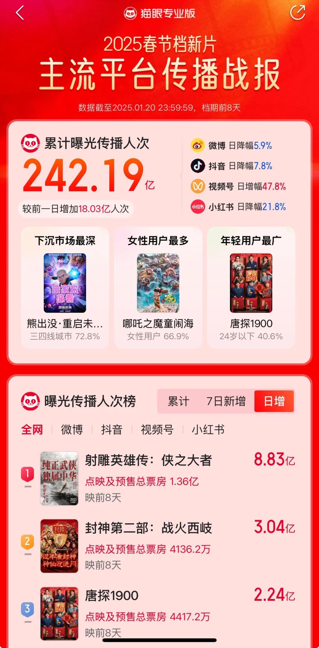 2025春节档,从全民熟悉的武侠经典《射雕》、到五年才盼来的《哪吒》、曾经票房创佳绩的《封神》、喜剧类大IP《唐探》、中低龄孩子最爱的《熊出没》、以及弘扬主旋律的《蛟龙行动》,每一部都是投入大量资金和资源创作的影片。