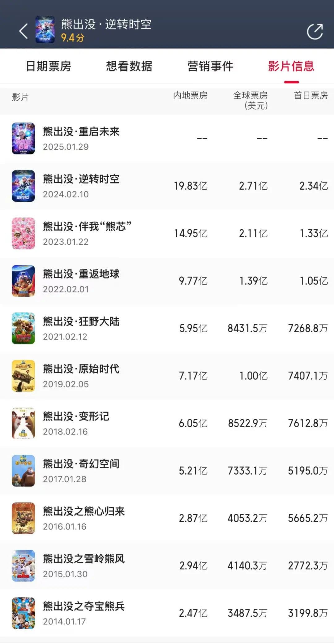 《熊出没》属于少儿电影,通常一个低龄儿童至少需要一个成人陪伴,所以票房不可小觑。可以看到这个IP的票房成绩一路高歌猛进,2024年春节档《熊出没-逆转时空》票房19.83亿,比很多成年人观看的电影票房更好。而今年的《熊出没·重启未来》是科幻五部曲的最终篇章,不仅在动画制作技术上不断进步,更在内容上加入了奇幻、神话、科幻等众多元素,目前看至少儿童市场的大盘较为稳定。