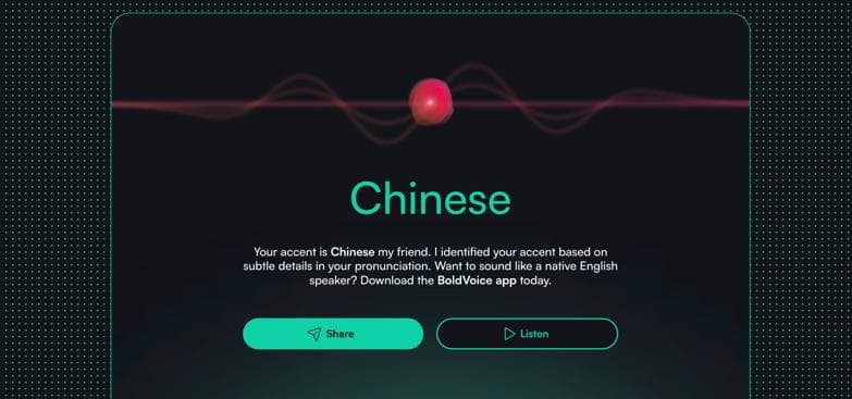 最近,简中互联网上“英语口音测试”突然风靡。玩法很简单,只需要访问特定链接,按照指示录制一段英文语音,数秒后你将会得到一个检测到口音归属国家的结果。(访问网址:https://start.boldvoice.com/accent-guesser)