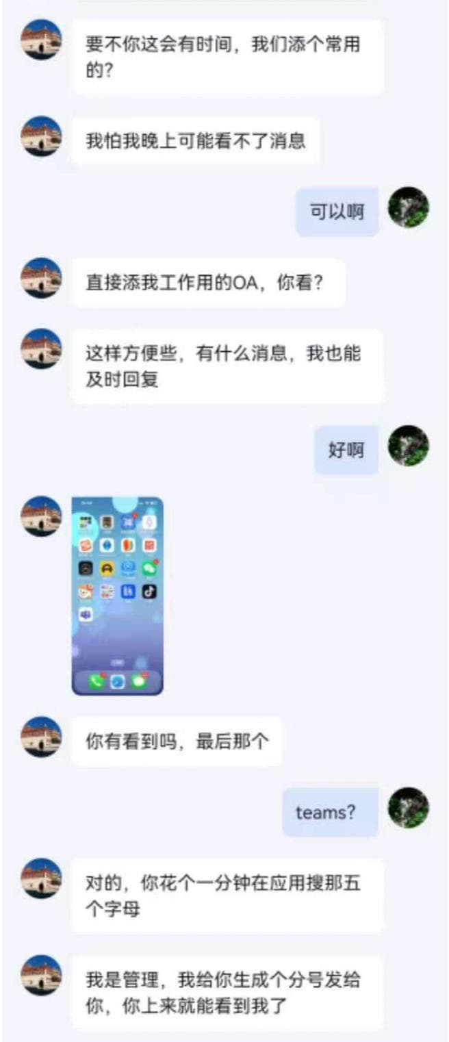她和对方聊过几次之后,对方就邀请她在 Teams 上交流。何桦说,对方在脉脉聊天中提出在 Teams 上继续聊天时,脉脉并未弹出风险提示。一开始双方在 Teams 上的交流还算正常,没有涉及钱财方面,聊天话题大多是生活习惯、日常爱好之类。