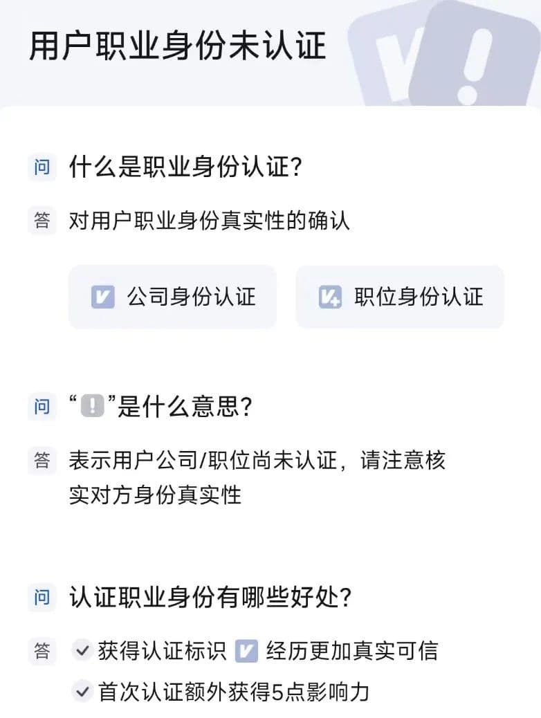 但用户在具体使用过程中,有时会忽略掉相关的认证提醒。“其实像感叹号这块,有时我们自己换了工作后也不会那么及时地更新。”Kelly 说。