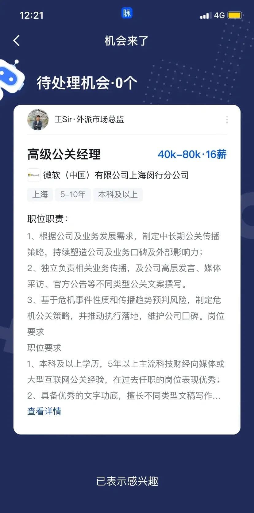 在互联网公司工作的市场公关人士李水(化名)向《山上》介绍,去年 4 月,她在脉脉上刷到一则微软公司的官方招聘信息,发布者是一位经过了企业认证的微软外派市场总监,在页面上点击“感兴趣”之后,她开始与对方建立联系。
