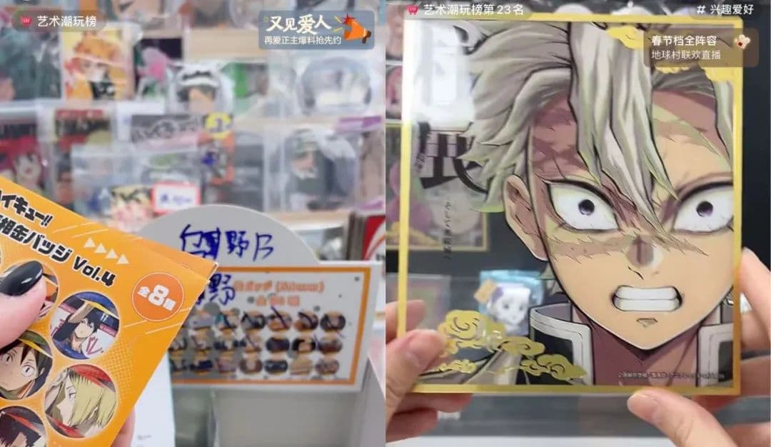 比如在国内拥有庞大受众群体的日漫IP,购买相关周边无论是走动漫周边连锁品牌店的渠道还是个人代购渠道,等待周期都较长。以《排球少年》近期推出的应援团系列徽章为例,该周边近日已经在日本发售,目前模玩熊、万社屋等电商平台周边大店显示仍在等待商品出货,但就在1月18日前后,该周边现货便出现在了抖音和小红书的一些拆卡直播间。