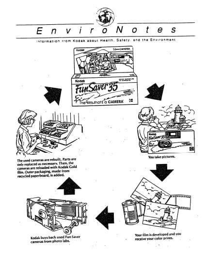 或许为了节约成本,也或许为了安抚环保人士,柯达和富士在1990年相应推出回收计划。柯达会给照片冲印人员支付运费,让其将洗完的相机送至回收处理站,对相机进行检查和拆卸。此后,相机的塑料机身可以重复使用6次、闪光灯电路10次,而无法重复使用的塑料部件被磨成可重复使用的颗粒、纸板标签被焚烧为制造设施提供能源。
