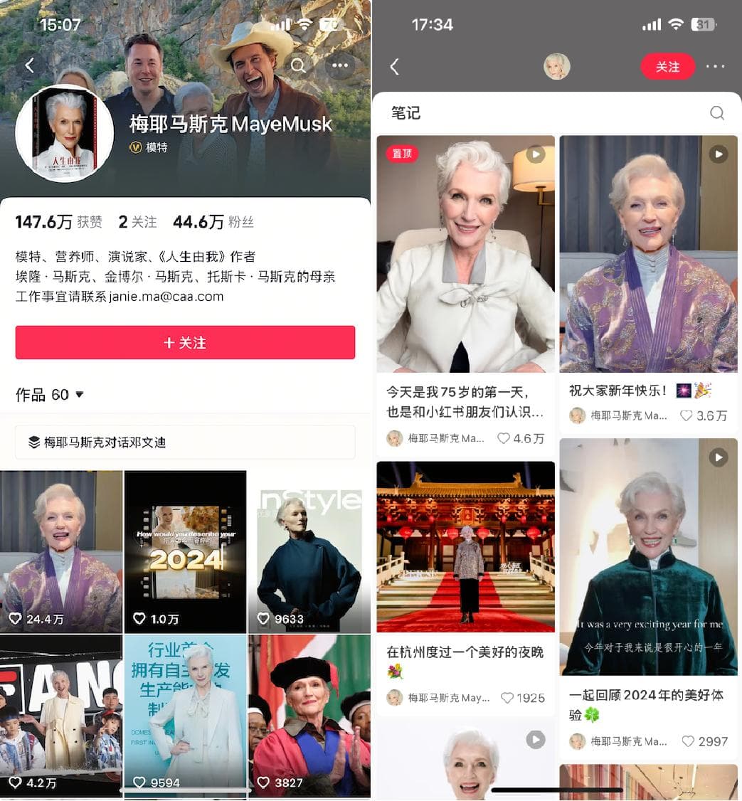当美国网友来到小红书这个陌生的中国App,却惊讶地遇见了老熟人——埃隆·马斯克(Elon Musk)的母亲梅耶·马斯克(Maye Musk),而且她居然是已经入驻4年的小红书“原住民”。于是,评论区炸了。