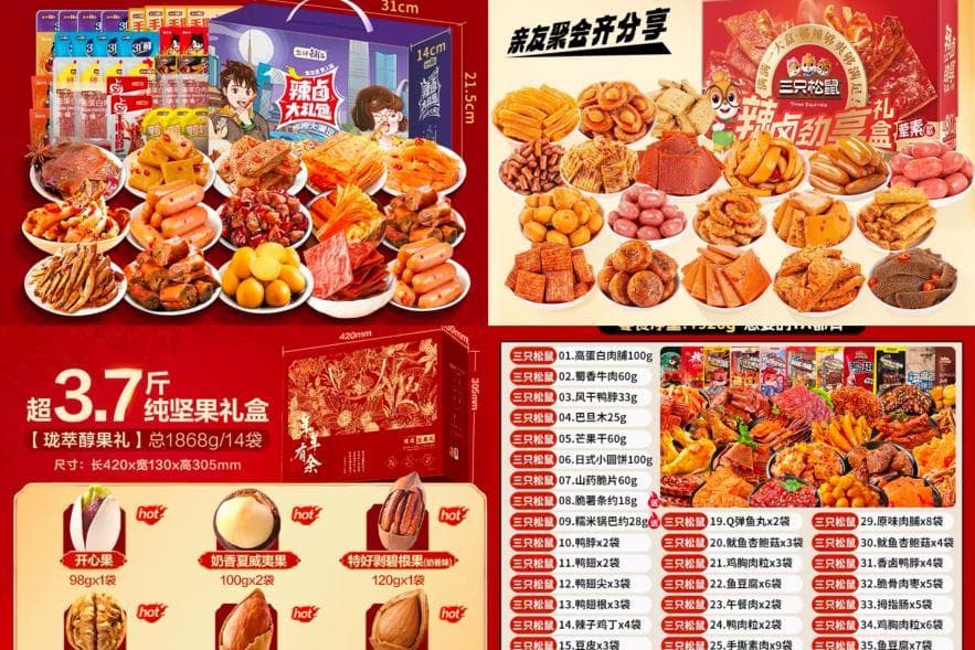 以零食礼包为代表:盐津铺子春节礼包,一个辣卤礼盒可以装下19种品类,200包卤味;三只松鼠的肉食大礼包,设置了18种口味,能装下169款零食;良品铺子坚果礼盒放置了10种坚果、14袋礼盒...