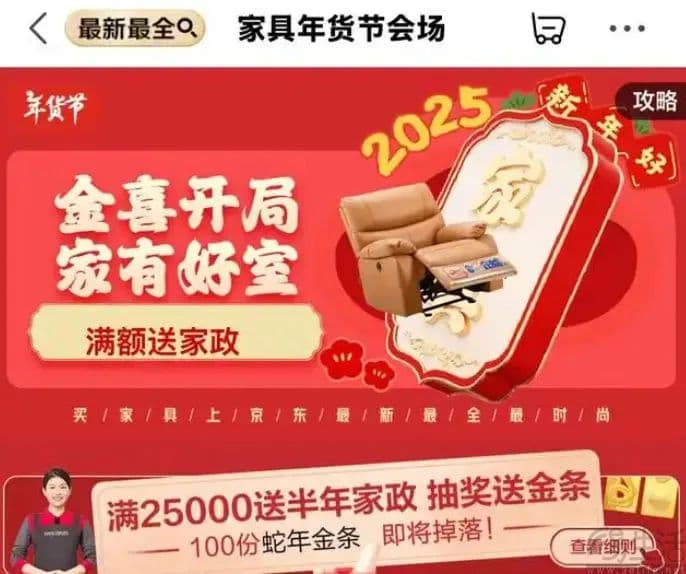而且为了能够更丝滑地从电商行业切入本地生活服务赛道,京东方面似乎也早有准备。据了解,不久前京东年货节正式开启,此次大促的主要福利之一便是买家具送家政服务。具体而言,凡是在2025年1月8日24点前购买部分自营家具、并完成付款,单笔订单实付金额满25000元的消费者,即有机会获得“半年家政服务”。