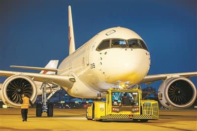 东航技术国产飞机维修部工作人员指挥牵引车将C919大飞机牵引至机库。