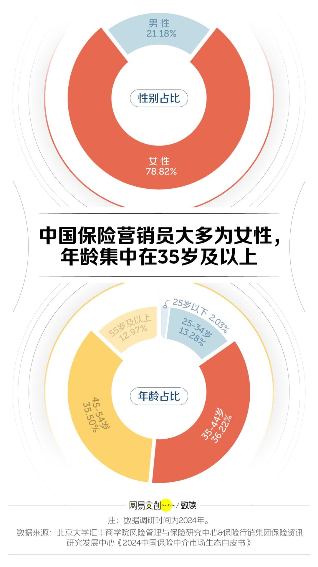 由北京大学汇丰商学院发布的《2024 中国保险中介市场生态白皮书》,也佐证了“35+ 职业转型保险业”并非只是个段子,报告呈现的保险营销员群体画像,在年龄结构上,35-54 岁占到将近四分之三的比重。