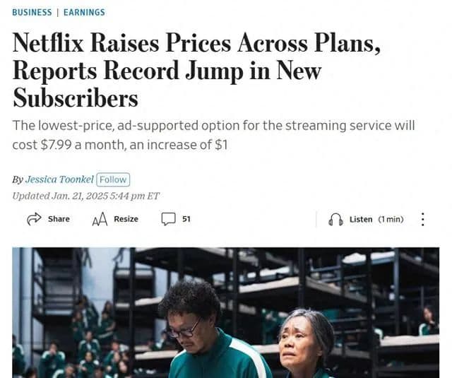 鉴于业务成长的强劲势头,Netflix还在财报见市当天宣布自2022年以来的第三次提价,涵盖美国、加拿大、葡萄牙和阿根廷等国家。以美国为例,无广告标准版的月费从15.49美元涨至17.99美元,入门级广告版则从每月6.99美元升到7.99美元。这次提价无疑将驱动会员人均收入继续上扬,凸显Netflix管理层对公司服务的信心。