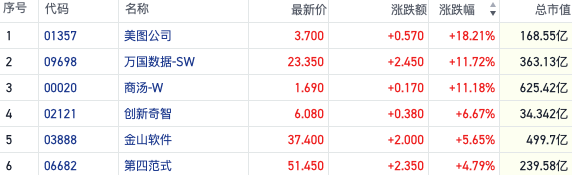 截至发稿,美图公司(01357.HK)涨超18%,万国数据-SW(09698.HK)、商汤-W(00020.HK)双双大涨逾11%,金山软件(033888.HK)、第四范式(06682.HK)等公司跟涨幅度也在5%以上。