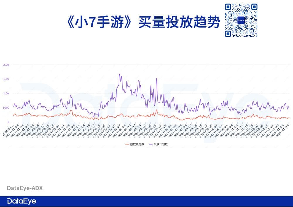 根据ADX数据,目前长尾渠道比较头部的《小7手游》持续买量投放,每日投放素材在1000-2000水平,对应计划数4000-6000水平。