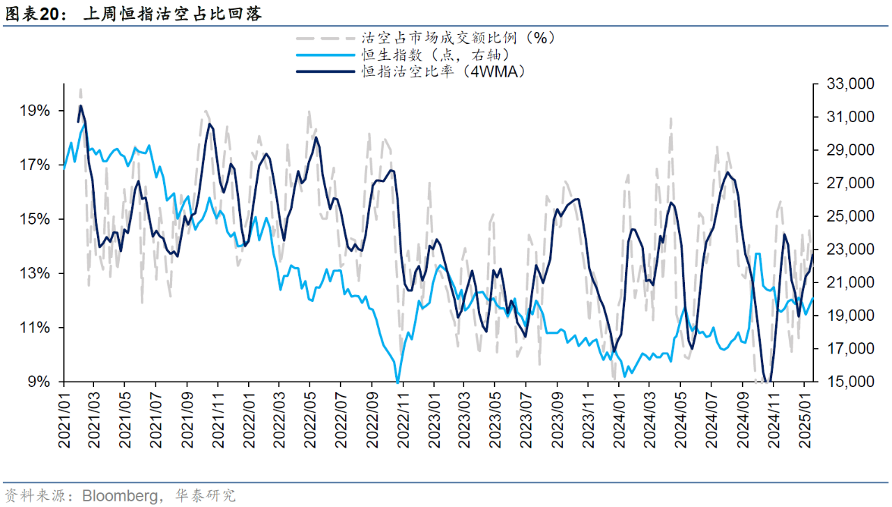 比如上周恒指沽空交易周平均占比小幅回落至13.1%、且周五单日降至12.1%,空头回补或助推上周港股行情,但目前仍处于历史中性水位。