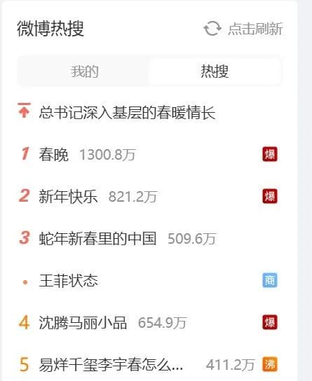 除夕夜,央视春晚如约登场,歌曲、舞蹈、相声、小品、戏曲、武术、魔术等各类型节目应接不暇。当晚,微博热搜、百度热搜都被春晚“霸屏”了。