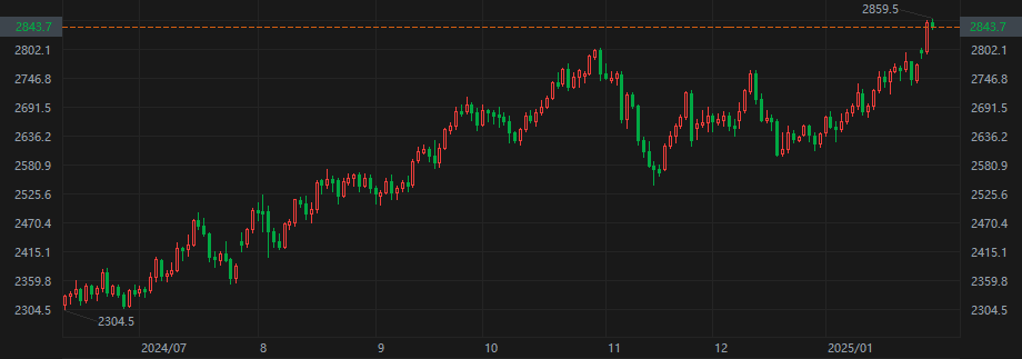 美国黄金期货价格日内微跌,现报每盎司2843.7美元。昨日,黄金期货价格也录得历史新高,为2859.5美元,但今天未能突破这一高度。