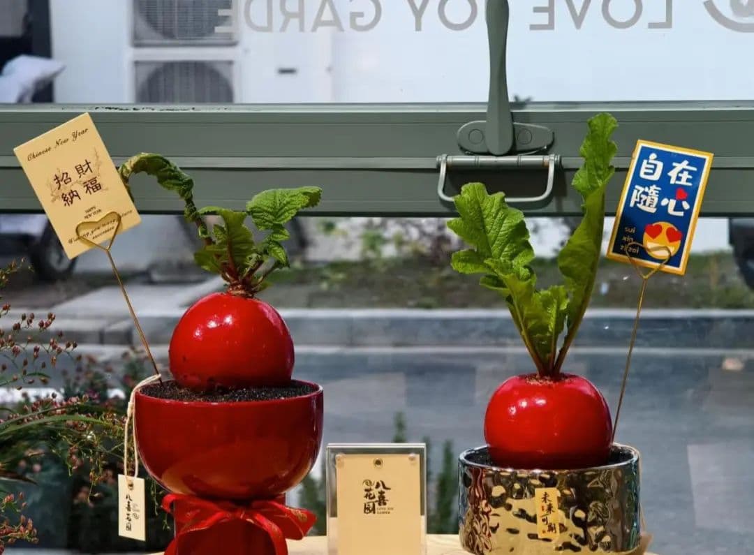 现在,作为年宵花的红皮萝卜,不仅被洗得干干净净,有了自己的精致小瓷盆独居单间,还被贴上了各种吉祥挂饰,就连身价也翻了20—50倍——在不同地区和花店里,一盆红皮萝卜年宵花,售价能达到28—100元。