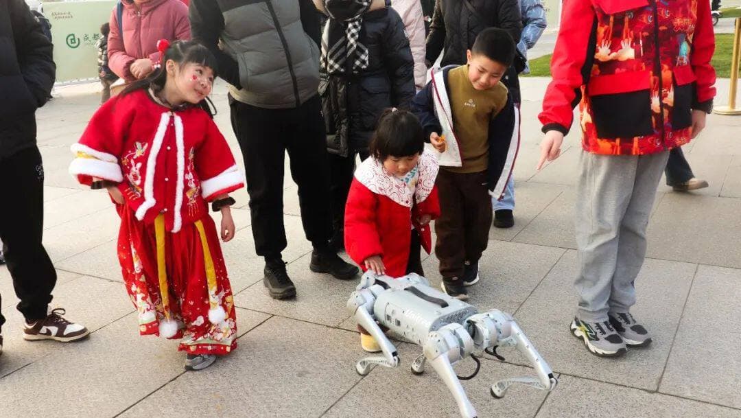 在交子音乐广场另一侧,同由四川具身人形机器人科技有限公司研制的机器狗“灵瞳”正向前来游玩的小朋友“撒欢”,还不时为人们表演跳舞。