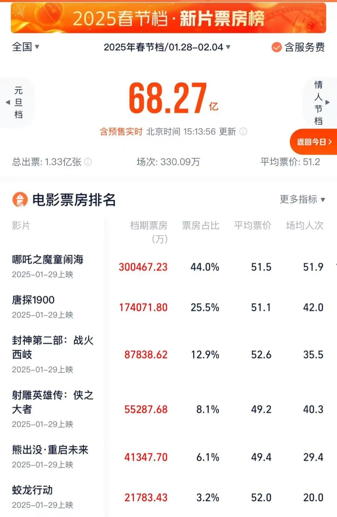 据灯塔专业版实时数据,截至2月2日15时,2025年春节档票房(含预售)突破68亿元。其中,《哪吒2》《唐探1900》《封神第二部:战火西岐》分列票房榜前三位。