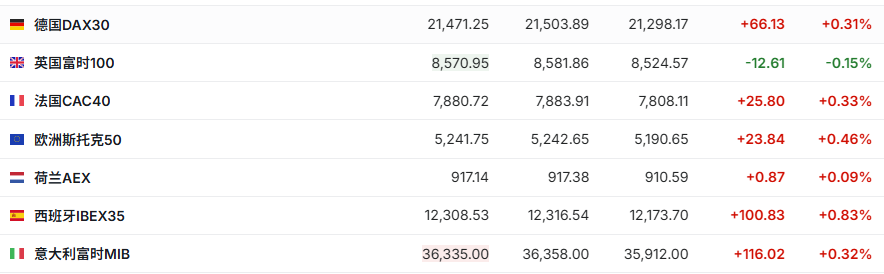 正在交易的欧洲股市多数走高,德国DAX30指数现涨0.31%,英国富时100指数跌0.15%,法国CAC40指数涨0.33%。