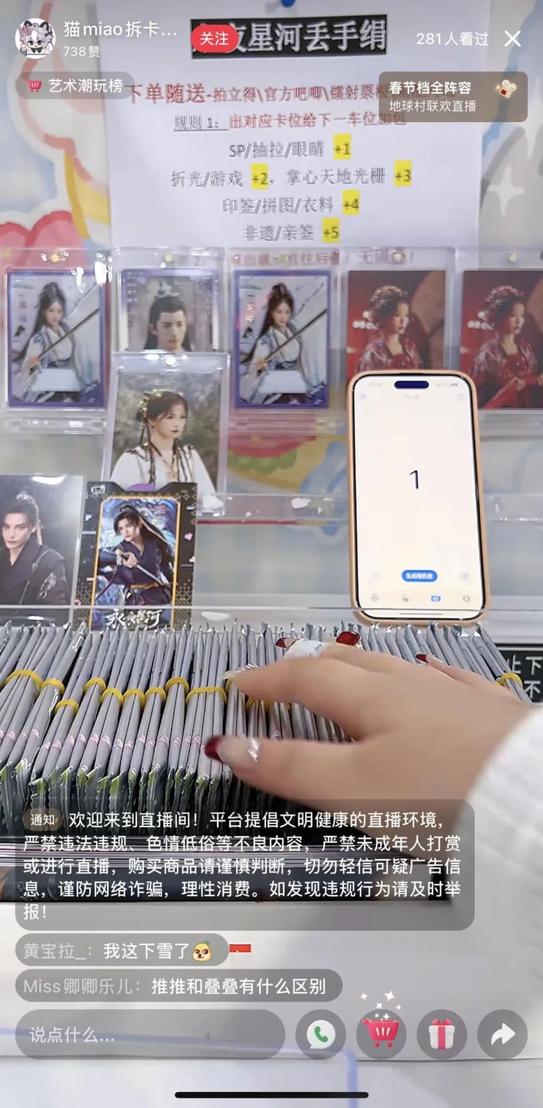 作为直播间常客,@仔仔和@阿然表示,“直播间拆得最快、省事,并且参与感也强。一开始玩卡,也是刷到直播间才接触的。”小红书主播@猫miao拆卡则向娱乐资本论表示,直播间会形成自己的粉丝群,主播会和粉丝们经常聊天、互送礼物,“熟客也是很重要的收入来源。”