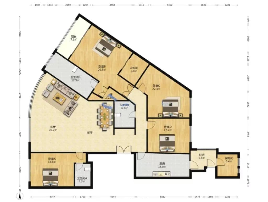 房间应该方方正正,少点金角银边的。多边多角的户型不仅难于摆放家具,而且浪费实际面积,整体空间会显得狭窄和局促。