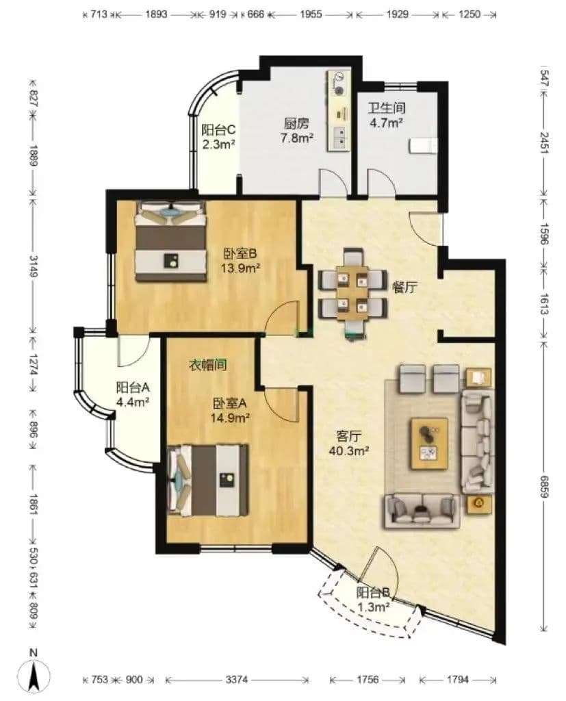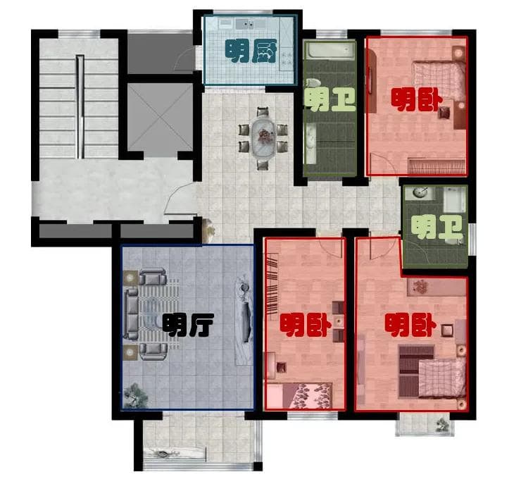 动区:客厅、餐厅、厨房等活动较频繁的区域,靠近入户门设计;静区:卧室、书房、主卫等应该尽量布置在户型内侧。