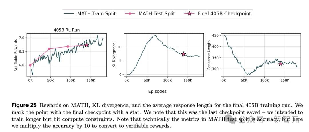 上图展示了在405B的参数量上,MATH数据集的可验证奖励、KL散度和模型响应长度随训练轮次的变化曲线,总体而言,可验证奖励像在8B和70B设置中观察到的那样上升。