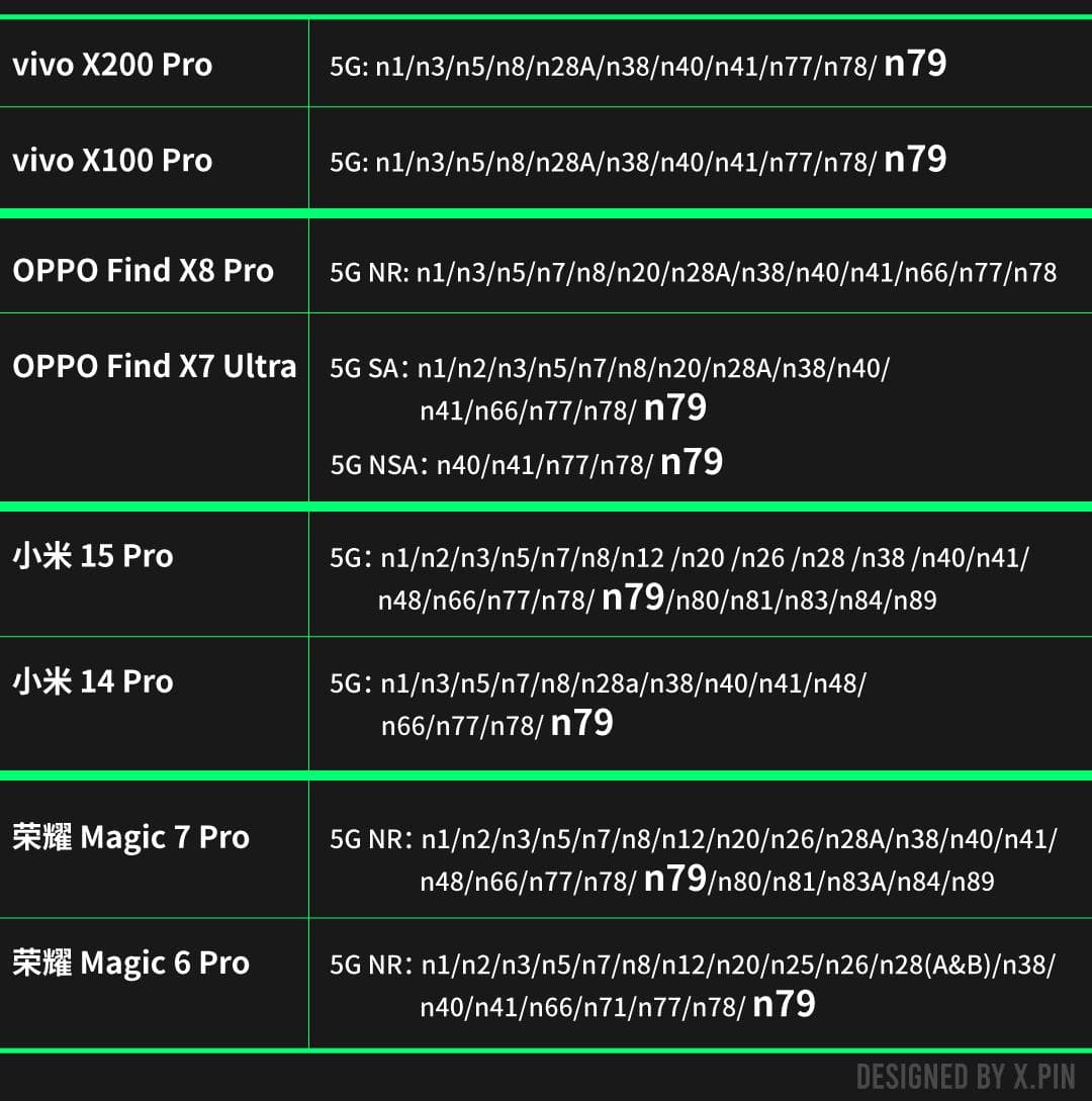 要么是多了,要么是少了,其中有一个频段特别扎眼,代号 n79 。很多厂商不管是上代还是这一代旗舰,都有支持。而个别厂商则是去年有,今年又砍掉了。