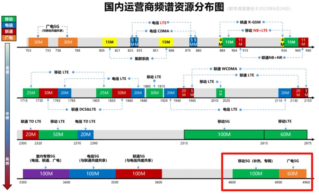 而从同行@鲜枣课堂整理的《国内运营商频谱资源分布图》来看, n79 这个频段目前被划分给了移动和广电用作 5G 频段。