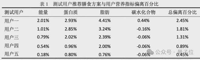 他们曾做过实际的调研,以随机五个用户进行分析计算推荐效果,各营养指标整体偏离百分比仅在1.39%,并且单项营养素指标偏离百分比不超过10%。