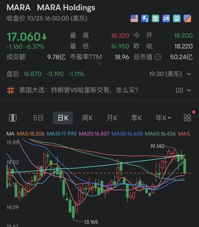 美股方面,与加密货币相关的股票也集体大跌,MARA Holdings股价一度下跌7%,Riot Platforms跌超5%。