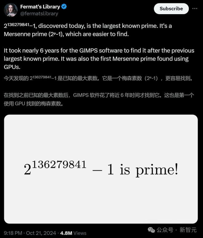 人类已知最大素数诞生:2¹³⁶²⁷⁹⁸⁴¹−1!前英伟达员工数千GPU爆肝